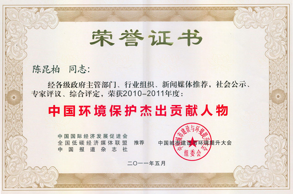 经各级政府主管部门、行业组织、新闻媒体推荐,社会公示、专家评议、综合评定,陈昆柏同志荣获2010-2011年度“中国环境保护杰出贡献人物”