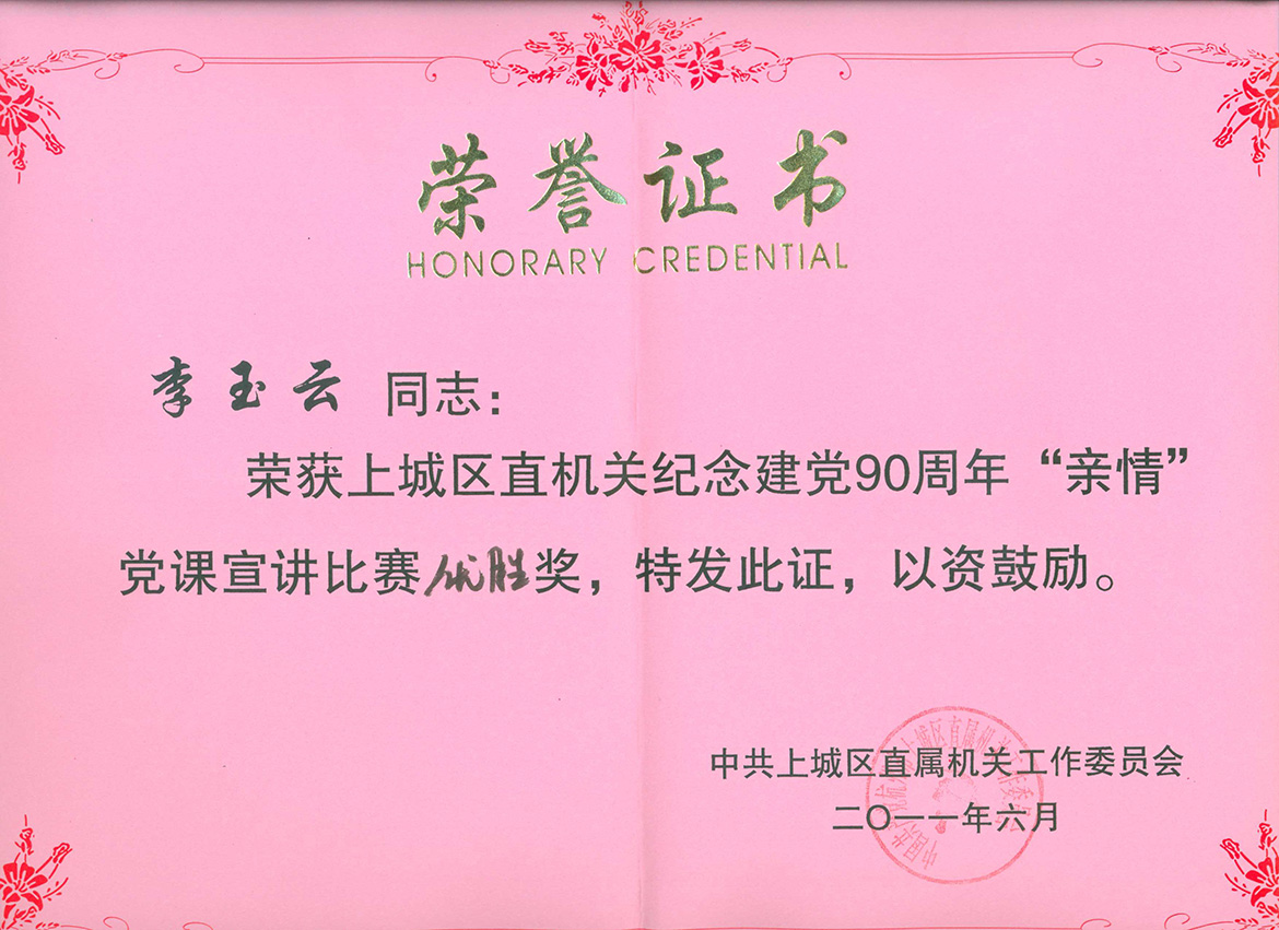 一、参加上城区直机关纪念建党90周年“亲情”党课演讲比赛,李玉云同志喜获三等奖