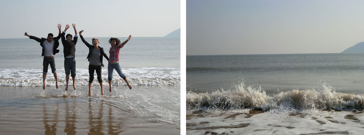 欣赏完美轮美奂的沙雕,我们来到了海边。沙雕城对面就是一片蔚蓝的汪洋大海。十一月的海边虽然有点冰凉,但也不能阻止我们看到宽阔大海激动的心情。我们迎着海风奔跑,放飞翅膀,放飞梦想,感受海天交接的壮观。今天的行程可以用一句话来描述:魅力舟山,快乐朱家尖岛;舟山朱家尖岛,欢乐沙雕城。