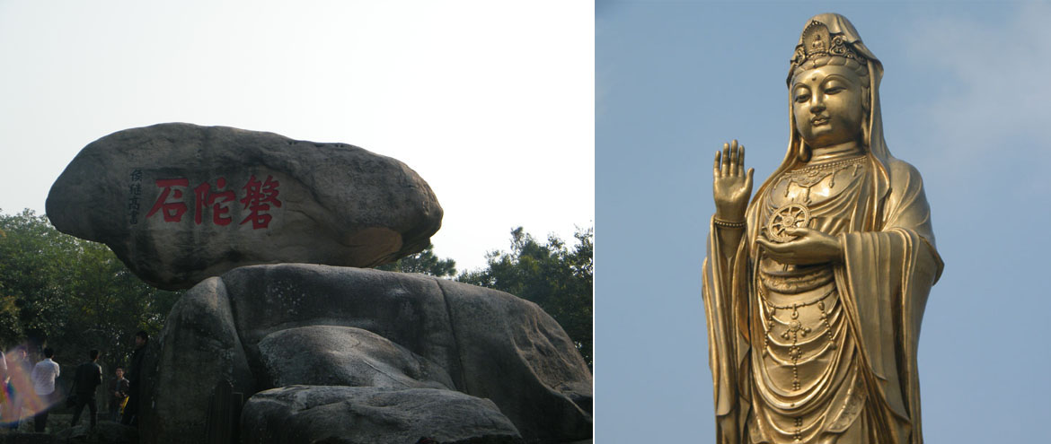 岛四周金沙绵亘、白浪环绕,渔帆竞发,青峰翠峦、银涛金沙环绕着大批古刹精舍,构成了一幅幅绚丽多姿的画卷,给人完美的视觉体验。岩壑奇秀,磐陀石、二龟听法石、心字石、梵音洞、潮音洞、朝阳洞各呈奇姿,引人入胜。