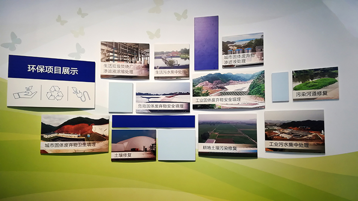 观赏了实景模型,我们再看展示墙,上面还有许多渗滤液处理,污水处理,固废处置等项目的现场实景照片,这些都是公司承接建设的项目,充分展示了公司在园区的关心支持下,通过科技创新,管理创新所取得的不凡成就。