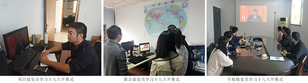 博世华全体党员在会议室准时观看了十九大开幕式,因工作原因未能出席的员工也在项目现场或以其他方式准时收看学习。