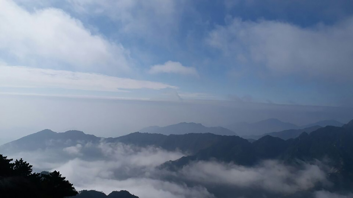经过漫长的排队等候我们终于坐上了上山的缆车。随着缆车的慢慢高升,缆车外雾气越来越深,穿过云层后看到黄山的真面目,黄山上特有的松树正向我们伸出手来欢迎我们呢! 真是好美啊!
