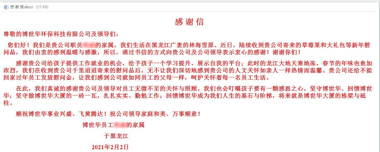 送“温暖”:公司的发展壮大,离不开每一位员工家属的鼎力支持和默默奉献。公司加大对假期坚守岗位、不能回家与亲人团聚的员工的关爱,通过“春节大礼包寄亲人”等活动,把博世华环保对员工的关心、关爱传达给留杭、留项目员工家属。近日,一个个寄托美好祝福的大礼包已陆续寄送至员工家属手中,有家属在收到大礼包后,激动地发来感谢信,感谢公司就如同员工的父母一样,呵护关怀着每一名员工生活及成长,同时也表达出对员工主动留杭的支持及理解。
