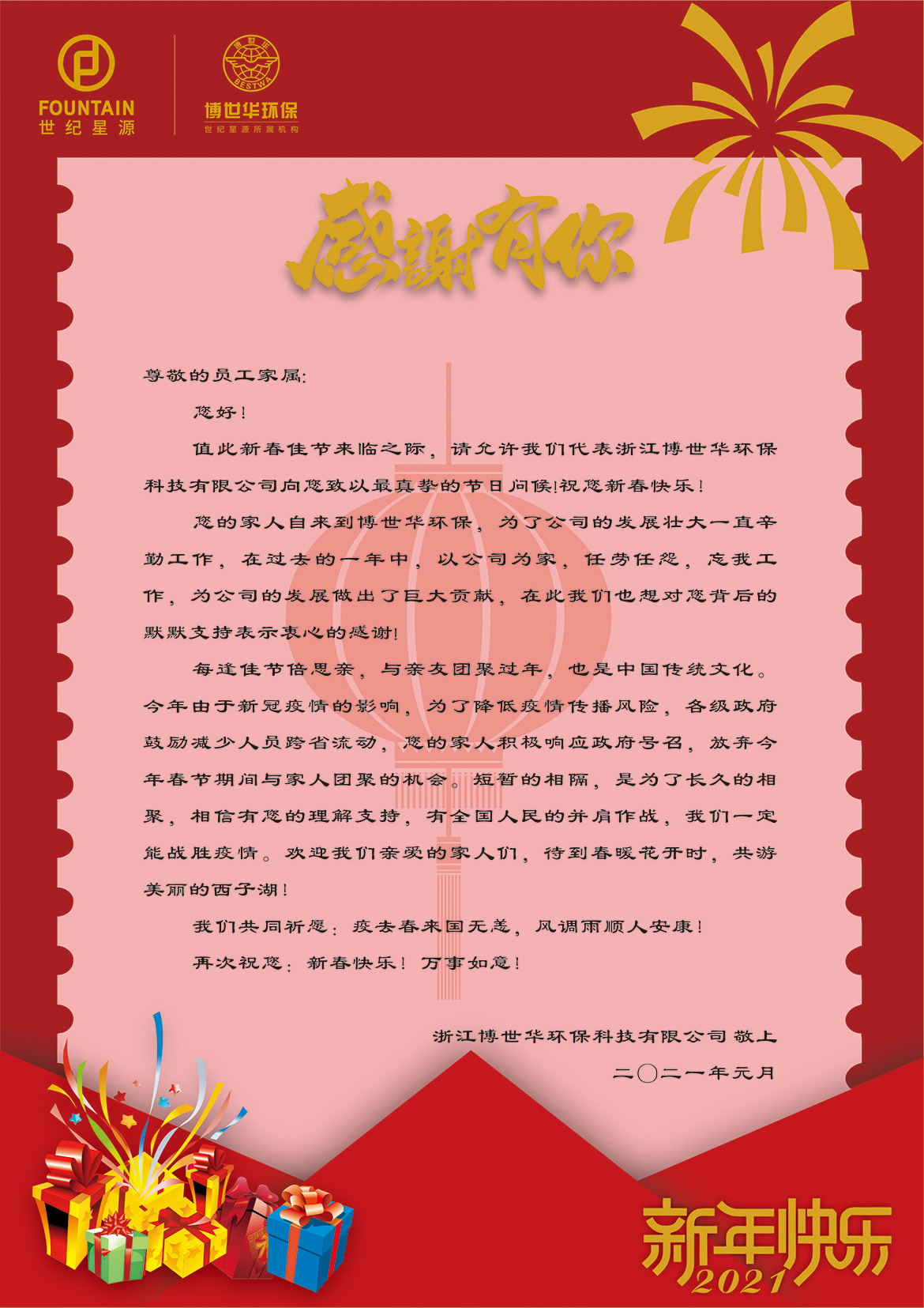 辛丑年春节将至,由于新冠疫情的影响,为了降低疫情传播风险,各级政府鼓励减少人员跨省流动。为了更好配合疫情防控工作,浙江博世华环保科技有限公司积极响应国家号召,在认真做好疫情防控部署的同时,开展了一系列丰富多样的关爱活动,鼓励支持员工春节期间留杭、留项目当地过节,让员工感受到“家”的温暖:
